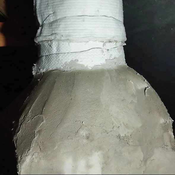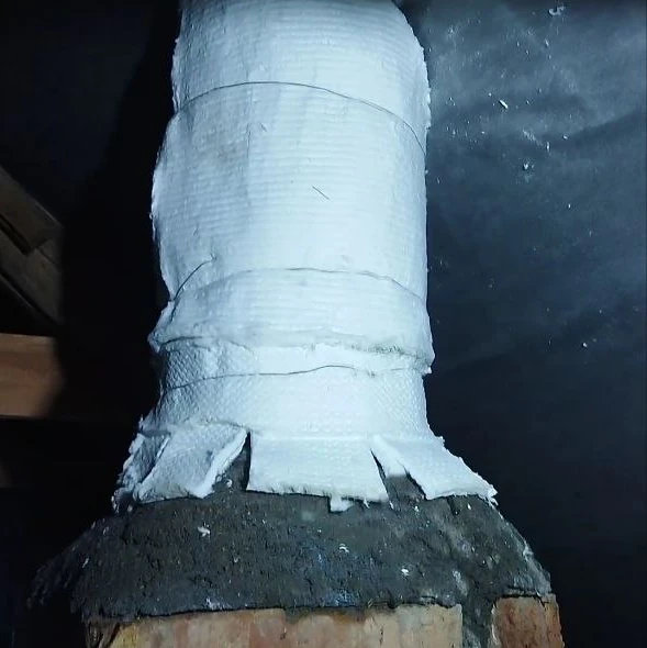 Противопожарная обвязка печной трубы в чердачном помещении негорючим стекловолокном.